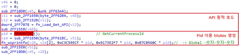 ○ 최초 실행하는 hpqhvind.exe는 PID를 이용해 뮤텍스 생성하여 중복 실행 방지
