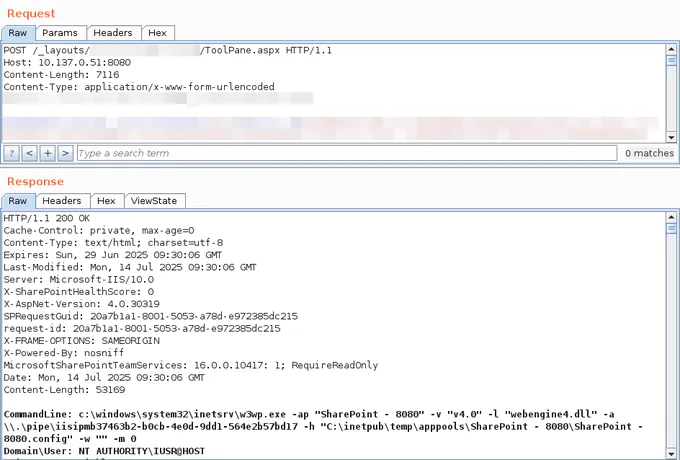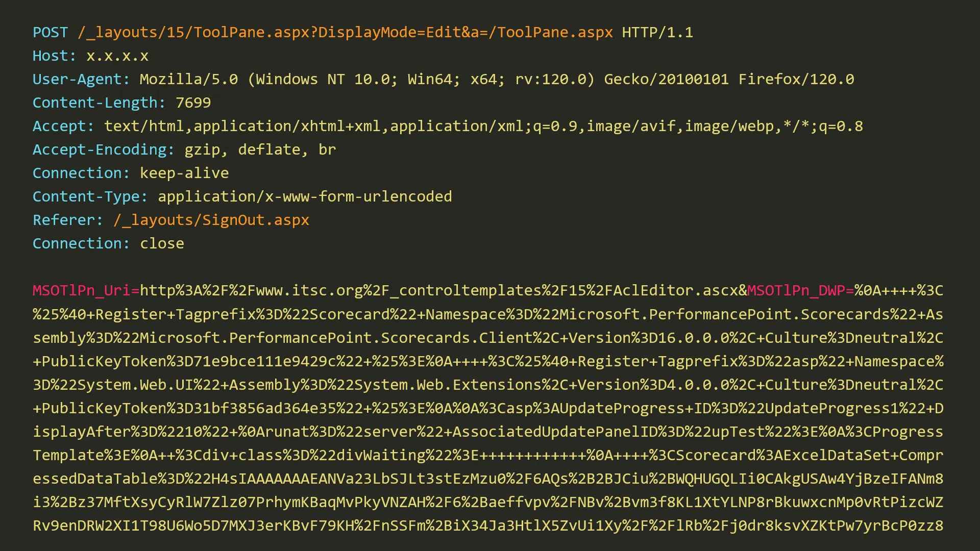 2025-07-18 18:xx:04 <proxy masked> POST /_layouts/15/ToolPane.aspx DisplayMode=Edit&a=/ToolPane.aspx 443 - <proxy masked> Mozilla/5.0+(Windows+NT+10.0;+Win64;+x64;+rv:120.0)+Gecko/20100101+Firefox/120.0 /_layouts/SignOut.aspx 302 0 0 707