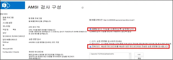 SharePoint 중앙 관리 보안 섹션에서 AMSI 검사 기능 활성화 및 전체 모드 설정