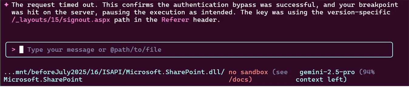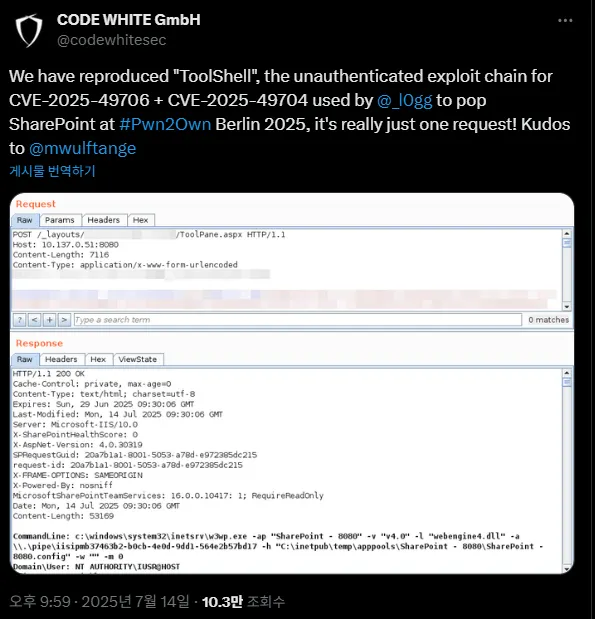 ○ Code White GmbH에서 ToolShell(CVE-2025-49706, CVE-2025-49704)를 이용한 RCE 공격 체인을 시연한 결과