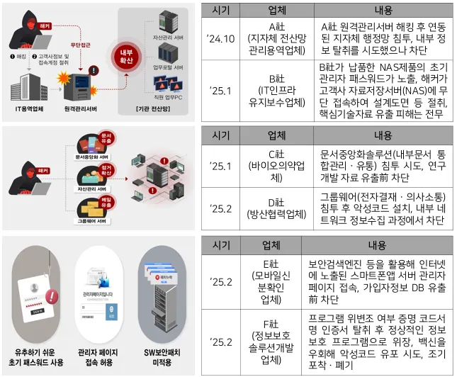최근 몇 년간 발생한 보안 사고 사례 분석 결과, 공격자들은 주로 소프트웨어 및 접근 통제의 취약점을 악용하여 내부망 침투와 핵심 정보 탈취를 시도하는 것으로 나타나고 있다. [표 2-4]와 같이 국가정보원에서는 북한발 사이버 공격 행위로 인해 2025년 국내에서 관리 서버 및 IT 인프라 대상의 침투 및 정보 탈취, 내부 문서 및 자료 관리 시스템을 통한 공격 시도, 프로그램 위·변조 및 보안 관리 소홀로 인한 피해 시도가 발견되어 사용자들의 주의를 권고하였다.