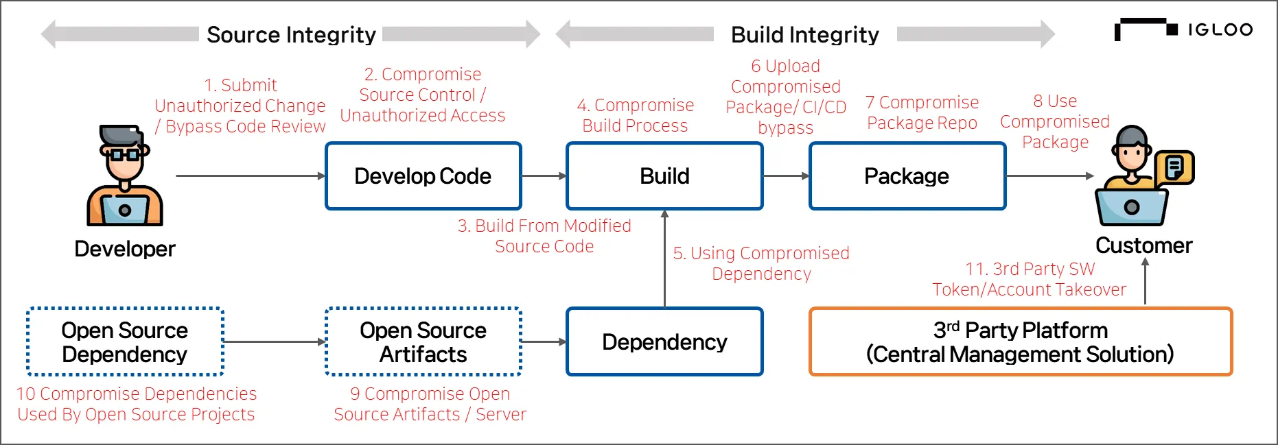 소스 무결성 단계에서는 개발자가 무단으로 변경된 소스코드를 제출하거나, 코드 리뷰를 우회하는 방식으로 스스로 코드 통제 및 무단 접근을 할 수 있다. 2020년 SolarWinds 공격에서 공격자들은 SolarWinds의 빌드 시스템에 침투하여 Orion 소프트웨어의 소스 코드에 악성 코드를 삽입하면서 18,000개 조직에 배포된 업데이트에 백도어가 포함되면서 미국 정부기관을 포함한 다수의 조직에서 피해가 발생했다.