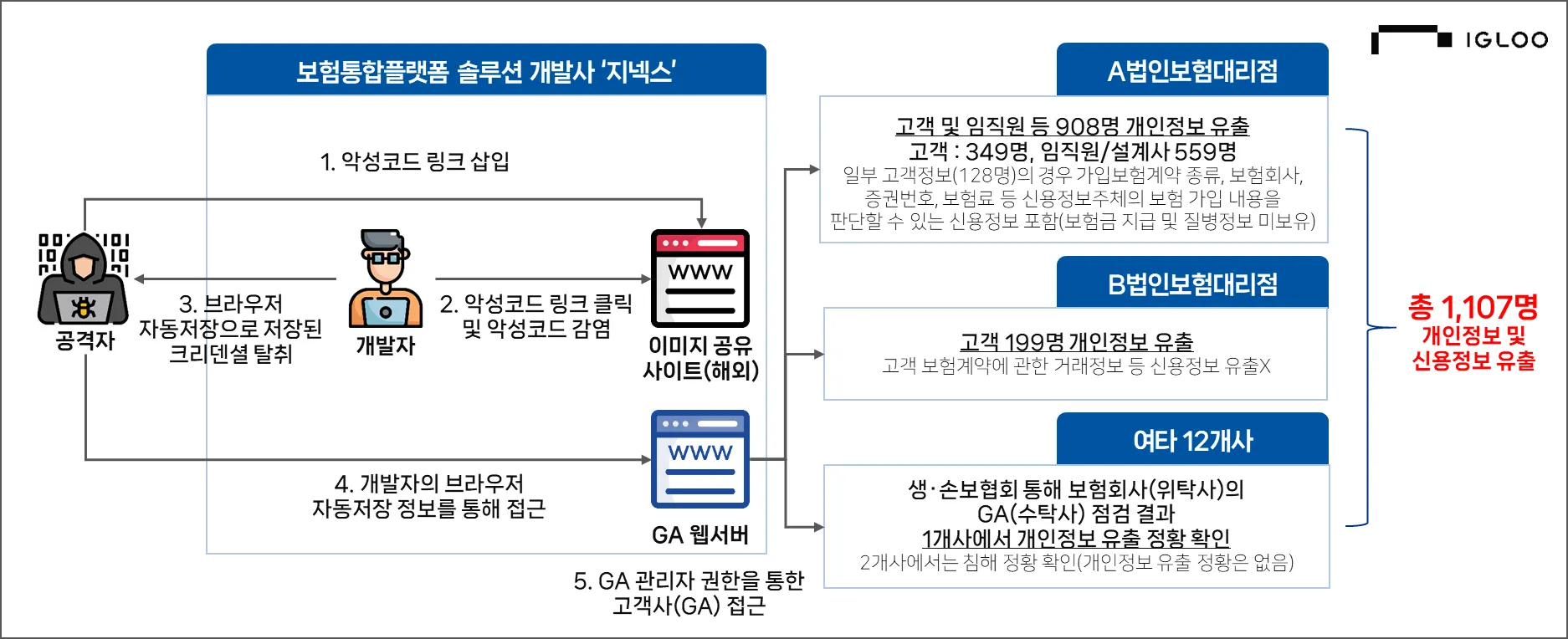 2025년 4월 국가정보원에서 보험 상품 판매를 전문으로 하는 법인보험대리점으로 GA소속 설계사는 소속 보험사 상품 이외에도 여러 회사 상품을 모두 판매 가능한 법인보험대리점 2개사인 유퍼스트·하나금융파인드의 개인정보 침해사고 정황 최초 인지했다. [그림 2-3]은 법인보험대리점 개인정보 유출 공격 구성도로 보험통합플랫폼을 제공하는 ‘지넥스’의 개발자가 해외 이미지 공유 사이트를 이용하는 과정에서 악성코드 링크를 클릭하면서 개발자 PC가 악성코드 감염되면서 개발자 PC에 고객사인 법인보험대리점 웹 서버 접근 URL 및 관리자 ID/비밀번호가 브라우저 자동저장 상태로 추정된다.
