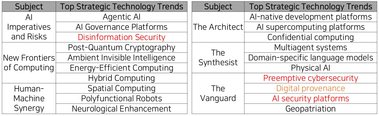 [표 1-1]에서도 AI를 통한 보안 생태계의 변화를 바람이 느껴지고 있다. Gartner에서는 AI의 폭발적인 증가로 인해 복잡성이 증가하고 이로 인해 필연적으로 자율 보안의 필요성을 이야기하고 있다. ‘Top Strategic Technology Trends for 2026’을 통해서 AI 중심의 초연결 사회에서 기업의 혁신, 경쟁, 신뢰 확보 방안을 모색하기 위해서 The Architect, The Synthesist, The Vanguard라는 주제를 통해 신뢰할 수 있는 안전한 AI 생태계를 통한 새로운 가치창출을 기대하고 있다. 특히 Preemptive cybersecurity(선제적 사이버 보안)과 AI security platforms(AI 보안 플랫폼)을 통해서 AI기반의 보안 운영 및 자율 사이버 면역체계 기반의 재해복구 체계를 통한 사전 대응을 강조하고 AI 관련 위험으로 부터 보호하기 위한 기술 제공의 필요성을 이야기 하고 있다.