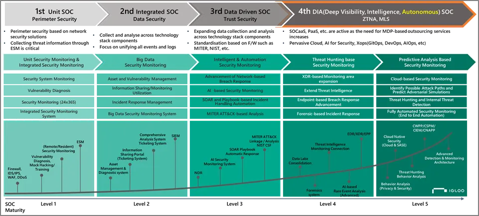 AI기술의 변화에 따라 SOAR, EDR, NDR, Threat Intelligence 등의 기반 기술들을 토대로 새로운 AI 기반의 SOC가 요구된다. 하위 기술들 역시 딥페이크, AI 피싱, 자동화된 공격에 대응하기 위해서 AI Native Threat Intelligence를 통해서 AI 공격표면관리가 필요해졌다. 특히 SOC환경에서는 AI Agent 기반 대응 자동화를 통해 Automation SOC를 넘어 Autonomous SOC가 요구된다. [그림 1-2]와같이 기존의 보안관제 생태계의 발전 방향은 DIA를 통해 높은 가시성(Deep Visibility)과 Threat Actor 프로파일링을 통한 AI Native Threat Intelligence, Autonomous SOC로 변화하고 있다.
