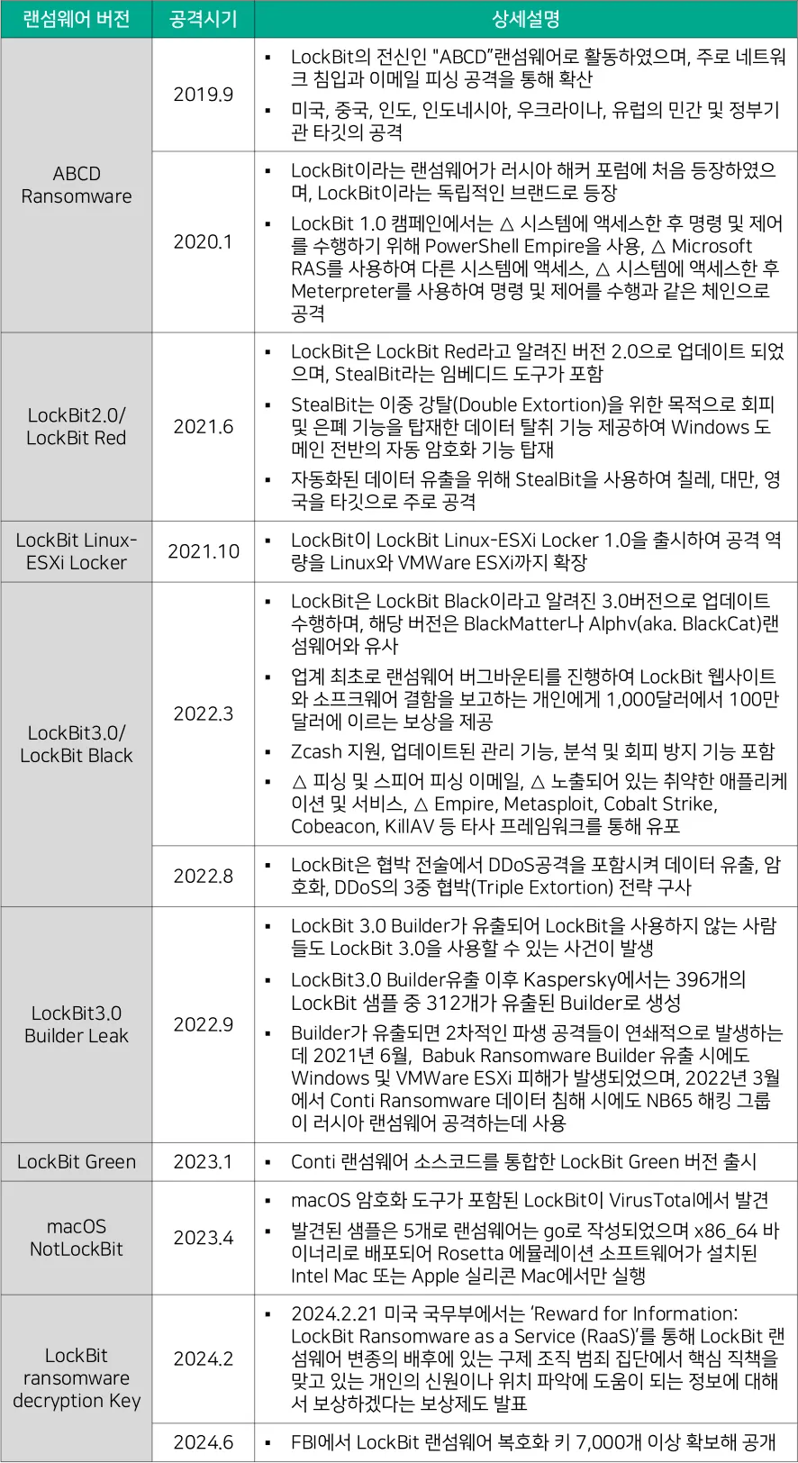 다양한 공격그룹과의 연계성과 제휴사를 통해 LockBit 생태계가 확산함에 따라, 2024년 2월부터 11개국이 대규모 대응 활동을 통해 LockBit의 인프라를 무력화하고, 이 과정에서 획득한 복호화키 7,000여개를 공개한 것을 미루어 LockBit의 영향력을 짐작할 수 있다. LockBit은 [보안 위협 표 3-1]에서 정리된 바와 같이 LockBit의 전신인 "ABCD”랜섬웨어로 활동을 시작하였으며 이후 정보 탈취가 가능한 LockBit2.0(LockBit Red)를 거쳐 Linux와 VMWare ESXi 공격이 가능한 LockBit Linux-ESXi Locker이후 LockBit3.0(LockBit Black)과 LockBit Green, macOS NotLockBit까지 발전되어 왔다.