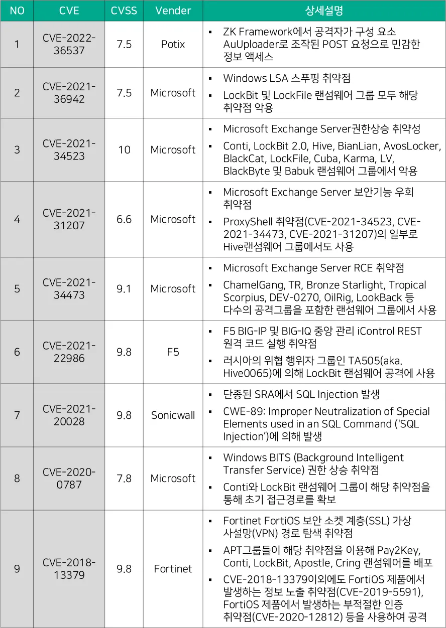 [보안위협 표 3-2] LockBit 랜섬웨어 그룹에서 주로 사용하는 취약점 목록 (9종)