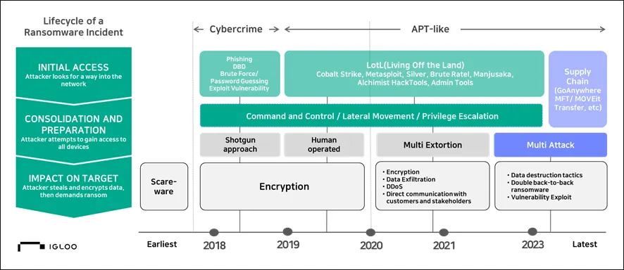 [보안위협 그림 3-1] 랜섬웨어 공격조직 및 공격기법 변화