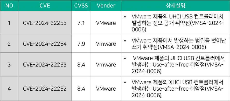 [보안 위협 표 3-3] LockBit 그룹 몰락 이후 Akira 그룹에서 사용하는 취약점 목록(4종)