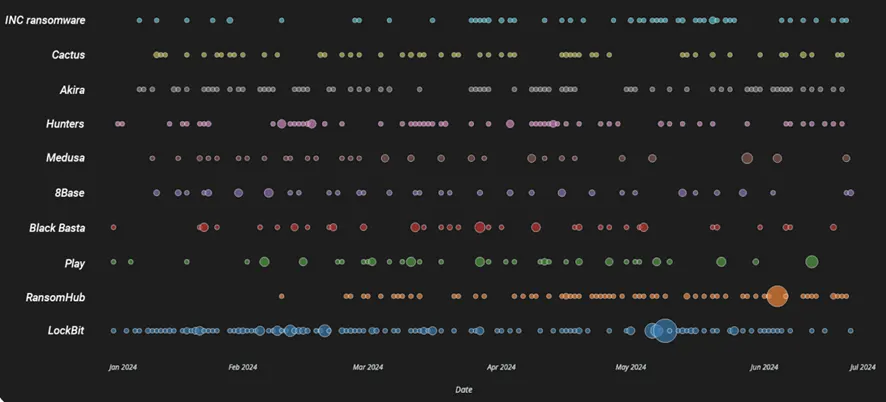 2023년 12월 19일 사이트가 다운된 ALPHV/BlackCat 랜섬웨어도 LockBit 랜섬웨어와 마찬가지로 PHP 8.1.2 버전으로 인한 CVE-2023-3824 취약점에 의해 서버가 장악된 것으로 추정되고 있으며, LockBit 그룹은 활동 재개의 입장을 밝히기도 했다. 이처럼 LockBit 랜섬웨어 그룹의 활동에 빨간불이 켜지면서 Rapid7의 ‘Ransomware Radar Report 2024’에 따르면 [보안위협 그림 3-3]과 같이 LockBit의 활동이 감소한 것을 알 수 있다. RaaS생태계에서 규제에 따른 변화가 제휴사를 포함한 사용자들의 신뢰도 하락으로 이어지면서 랜섬웨어 공격그룹이 와해하고 이를 통해 RansomHub과 같은 새로운 랜섬웨어 그룹이 생길 수 있다는 것을 알 수 있다.