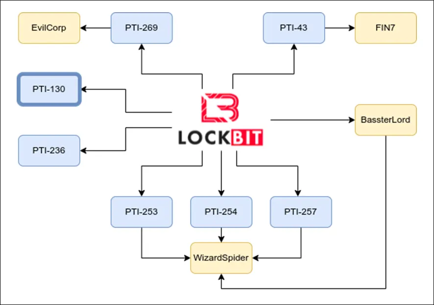 다음으로 살펴본 주요 사안은 ‘공급망 공격과 취약점을 이용한 공격 증가’다. 랜섬웨어 생태계에 막대한 영향을 미친 그룹을 꼽자면 단연 LockBit이라 할 수 있다. PRODAFT에서 발표한 ‘The Demise of LockBit: Disrupting the Most Prominent Ransomware Gang by Utilizing Upstream Threat Intelligence’에 따르면 LockBit 계열사는 [보안위협 그림 3-2]과 같이 PTI-269, PTI-43, PTI-130, PTI-236, PTI-253, PTI-254 및 PTI-257로 구성되어 있으며, 영국 국가 범죄 기관(NCA)에 따르면 2021년 28개 이상이던 LockBit 계열사가 3년 만에 194개로 증가하였다고 밝혔다. 이 과정을 통해서 FIN7, Wizard Spider, EvilCorp 그룹과의 연계성이 확인되었다.