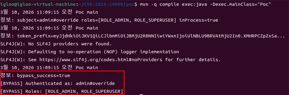 PoC는 Ubuntu(22.04.5), Java(17.0.18), Maven(3.6.3), pac4j-jwt(6.0.3 및 6.3.3) 환경에서 진행하며 별도의 웹 서버를 구축하지 않고 자바 코드를 프로세스로 직접 실행