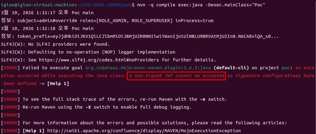 Maven 파일(pom.xml)에서 pac4j-jwt 인증 라이브러리를 취약한 버전(6.0.3)으로 설정 후 Poc.java 실행
