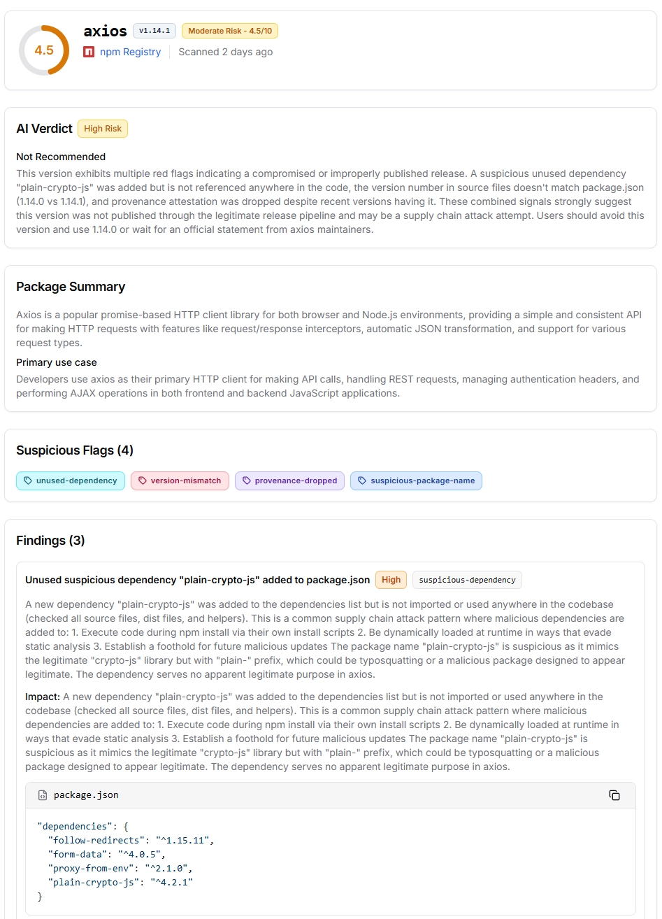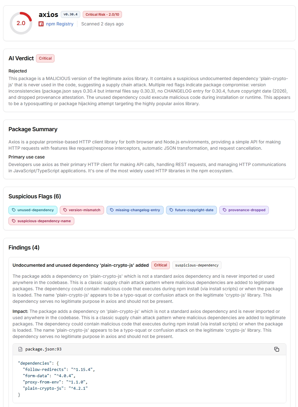 axios | 1.14.1 | 2026-03-31 00:21 | ~3 h 30 min | Removed by npm |