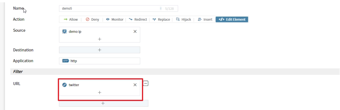 TSG 내에서 Twitter 차단을 위한 정책 적용 화면 예시
