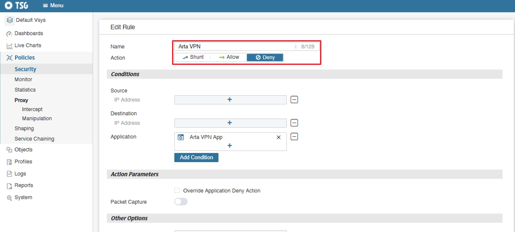 VPN 차단 룰(Rule) 생성 가능 화면