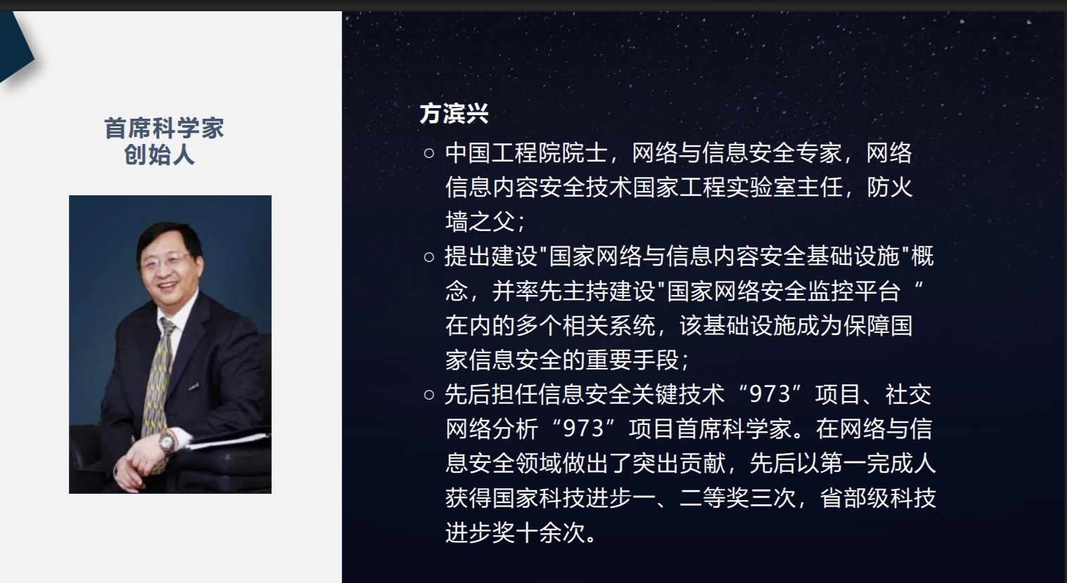 Geedge Networks 내부 회사 소개서에 작성된 Fang Binxing(方滨兴) 정보