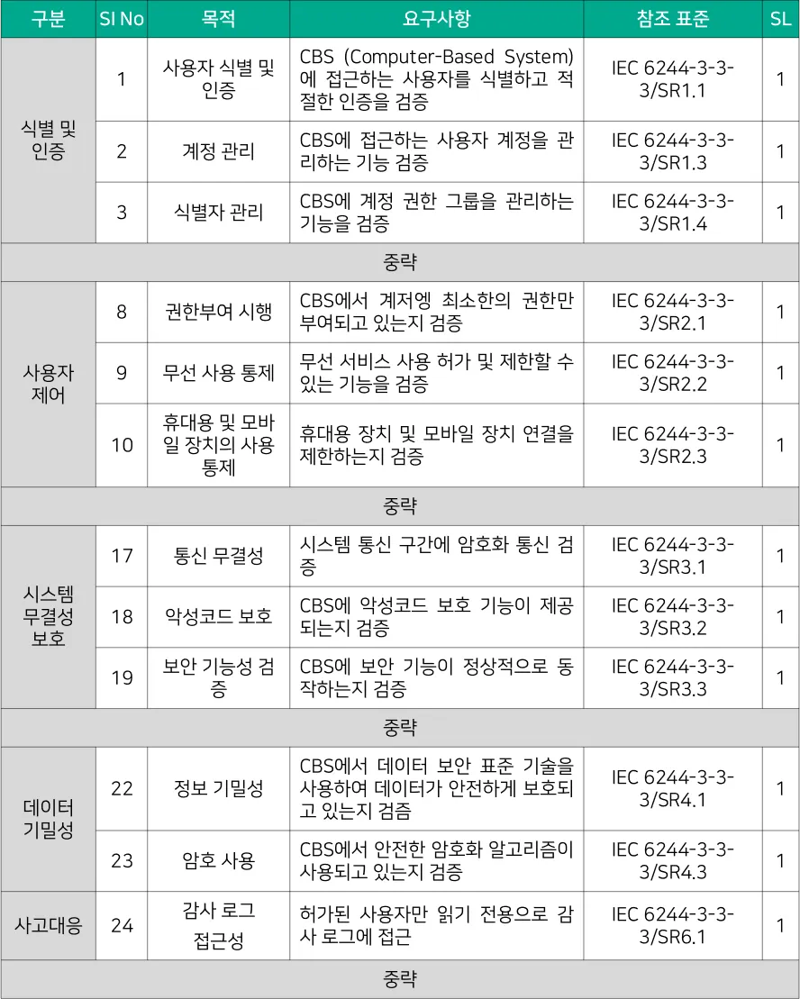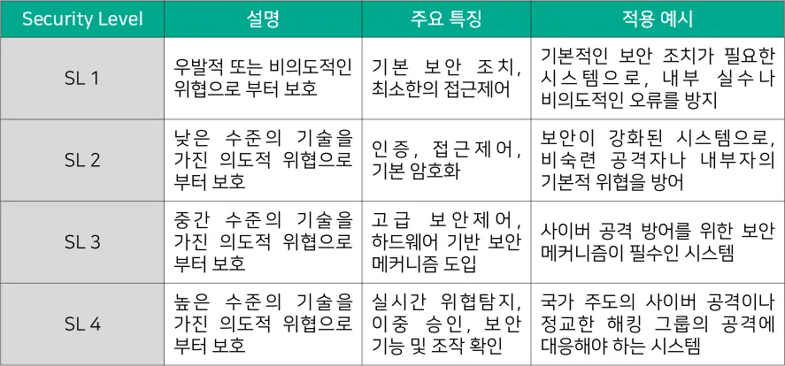 IEC 62443-3-3 Security Levels는 시스템의 보안 요구사항과 사이버 보안 능력을 정의하는 기준으로, 시스템이 특정 보안 위협에 얼마나 잘 대응할 수 있는지를 나타낸다. 이 보안 수준은 [대응기술 표 4-6]와 같이 SL 1부터 SL 4까지 4단계로 나뉘며, 각 단계는 점진적으로 더 높은 수준의 보안을 요구한다. 이는 IACS UR E27과 같은 규정에서 보안 평가 및 설계를 위한 중요한 기준으로 사용된다.