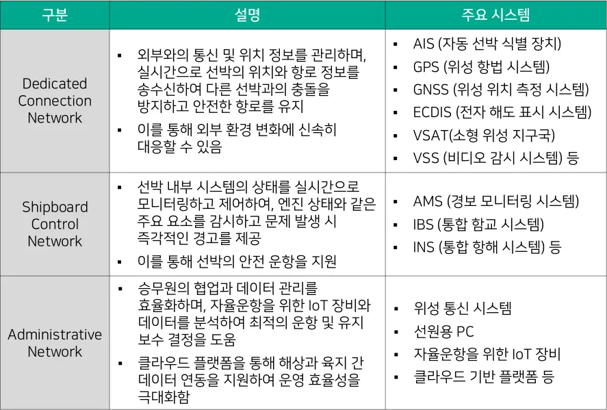 앞서 살펴본 기술들과 각각의 장비들을 연결하기 위해 선박 네트워크는 [대응기술 표 4-2]와 같이 Dedicated Connection Network, Shipboard Control Network, Administrative Network로 구성 되며, 각기 다른 역할을 수행하면서도 서로 유기적으로 연동되어, 선박의 안전성과 운항 효율성을 극대화하며 자율운항 및 스마트 해양 환경을 구현하는 기반이 된다.