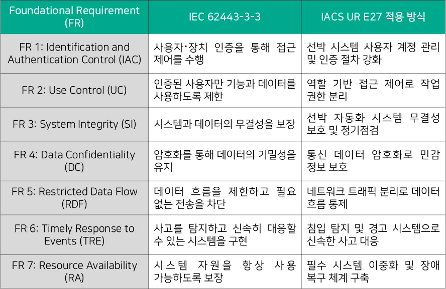 IEC 62443-3-3의 Foundational Requirements(FR)는 산업 자동화 및 제어 시스템의 사이버 보안을 위한 기본 요구사항으로, [대응기술 표 4-5]와 같이 IACS UR E27과 긴밀하게 연계된다. IACS UR E27은 해양 산업과 선박 시스템의 보안 요구사항을 규정하며, IEC 62443-3-3의 7가지 FR을 해양 시스템의 특수성에 맞춰 반영하고 있다.