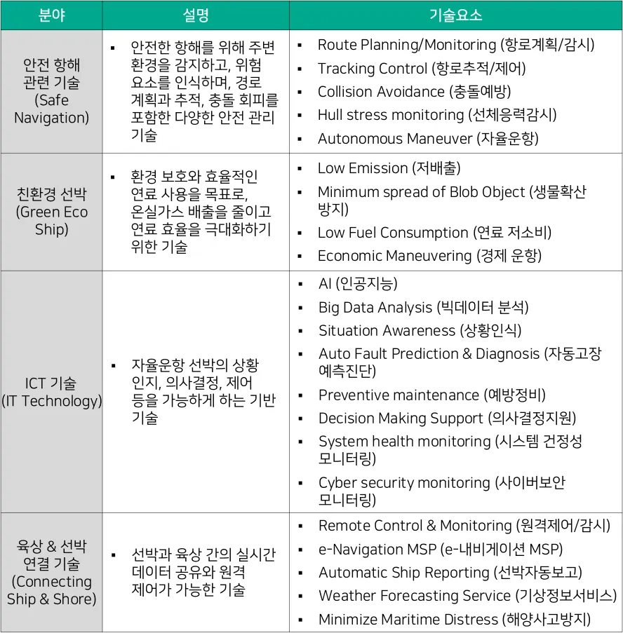 디지털화의 가속화로 해양 산업은 빠르게 변화하고 있으며, 스마트 선박과 자율운항 선박의 도입은 해양 모빌리티 체계를 한층 발전시키고 있다. ICT 기술을 기반으로 한 선박의 IT/OT 시스템 통합과 네트워크 연결 확장은 해양 운송의 효율성과 안전성을 크게 향상시켜, 운송 최적화와 실시간 데이터 분석이 가능해지고 운영의 투명성이 높아졌다. 자율운항 선박 분야의 국제표준화 회의인 ISO/TC8/WG10 스마트 선박(Smart Shipping)에서는 자율운항 선박에서 사용되는 ICT 기술의 적용 분야를 [대응기술 표 4-1] 와 같이 4가지 핵심 영역으로 분류하였다.