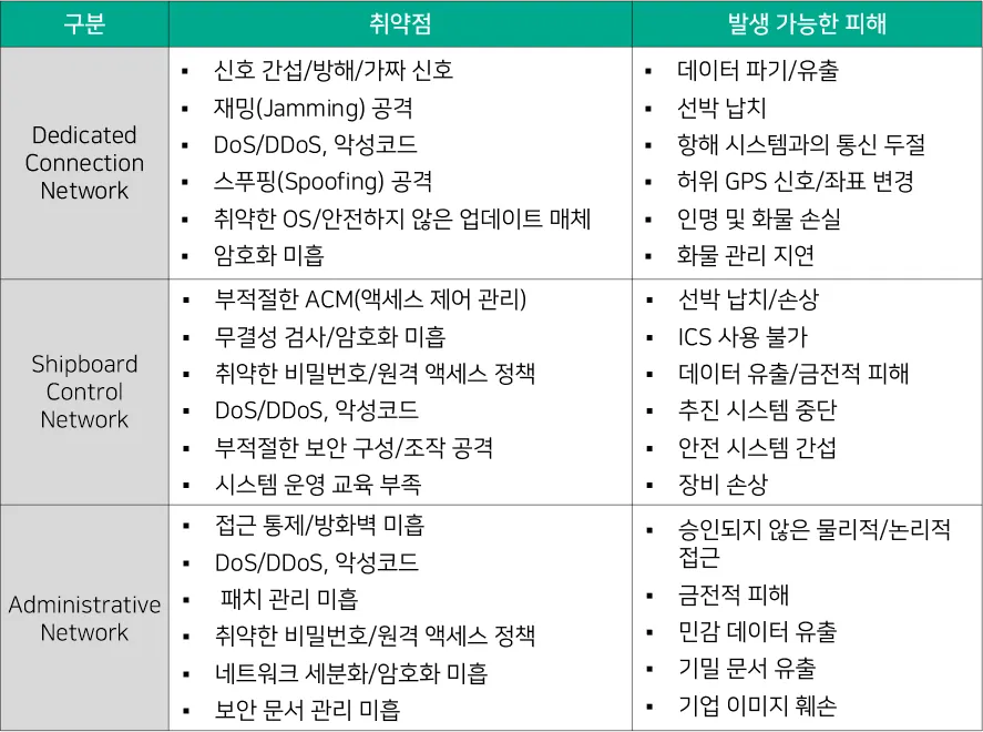 [대응기술 표 4-3] 네트워크 단계 내 시스템에 따른 취약점 및 발생 가능한 피해 (출처 : Cybersecurity Challenges in the Maritime Sector, MDPI)
