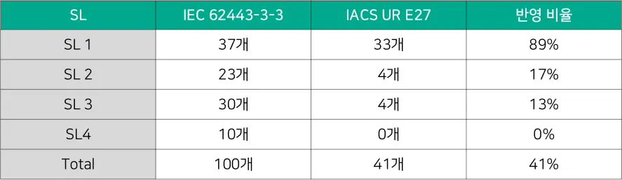 IACS UR E27의 보안 요구사항은 IEC 62443-3-3에서 정의된 보안 요구사항을 기반으로, 해양 산업 및 선박 시스템의 특수성을 반영하여 개발된 표준이다. IEC 62443-3-3에서 제시된 100개의 보안 요구사항 중 IACS UR E27은 41개의 요구사항(필수 요구사항 31개, 추가 요구사항 10개)을 채택하고 있으며, 주로 기본 보안 수준인 SL 1에 초점을 맞추어 선박 시스템에서 발생할 수 있는 일반적인 보안 위협에 효과적으로 대응하도록 설계 되었다. 그러나 고도화된 위협에 대한 대응 능력은 다소 제한적일 수는 있다.
