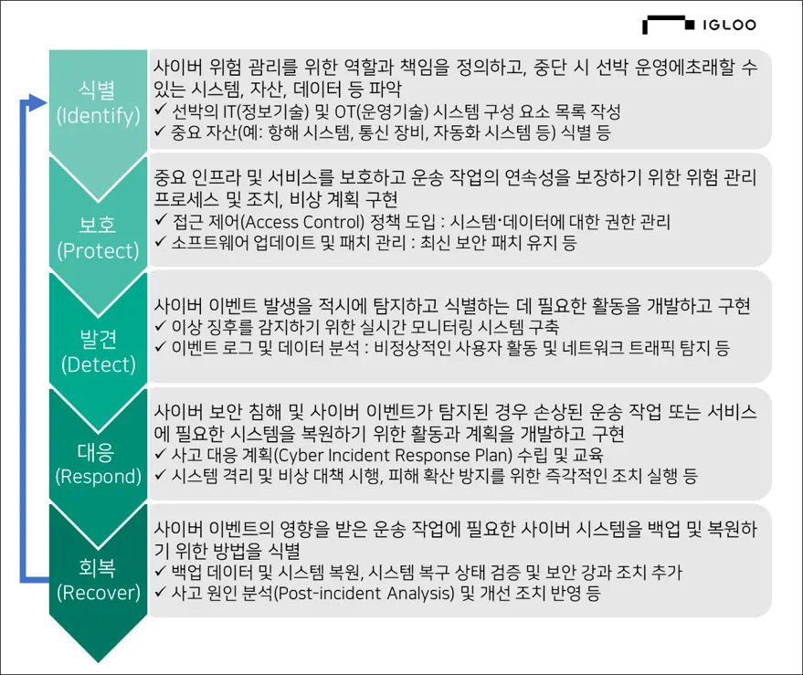 국제해사기구(IMO)는 해상 사이버 위험 관리의 중요성을 강조하며, 결의서 MSC.428(98)을 통해 선박의 안전하고 지속 가능한 운영을 보장하기 위한 구체적인 사이버 리스크 관리 체계를 구축하도록 요구하였다. 이는 2021년 1월 1일 이후부터 국제 선박 안전관리 규정(ISM Code)을 준수하는 모든 선박과 관련 조직에 적용되며, [대응기술 그림 4-1]과 같은 5단계 관리 프로세스를 필수적으로 요구하고 있다.