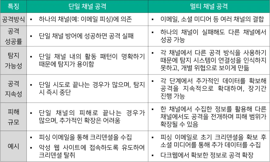 멀티 채널 공격은 [보안위협 표 5-1]과같이 단일 경로를 활용한 전통적인 공격보다 훨씬 정교하고 치명적인 위협을 제기한다. 이는 공격자들이 다양한 채널을 조합하여 복합적인 방식으로 표적을 공격함으로써, 탐지와 방어를 어렵게 만들기 때문이다. 단일 경로 공격은 특정 채널을 통해 목표를 달성하려 하지만, 멀티 채널 공격은 이를 넘어 여러 채널과 공격 벡터를 동시에 또는 연속적으로 활용해 표적 시스템에 침투한다. 멀티 채널 공격의 본질적인 위협은, 공격자가 한 채널에서 실패하더라도 다른 채널로 공격을 이어가 성공 가능성을 극대화할 수 있다는 데 있다. 예를 들어, 이메일 피싱에서 사용자가 링크 클릭을 거부해도, 동일한 악성 링크를 문자 메시지(Smishing)나 소셜 미디어로 전달함으로써 지속적인 공격 시도가 가능하다. 이처럼 다양한 경로를 활용하면 방어 시스템의 사각지대를 노릴 수 있다.