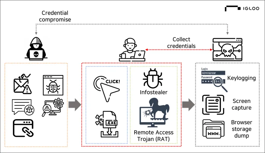 [보안위협 그림 5-2] RAT, Inforstealer 악성코드 주요 유포 방식 및 크리덴셜 탈취 시나리오