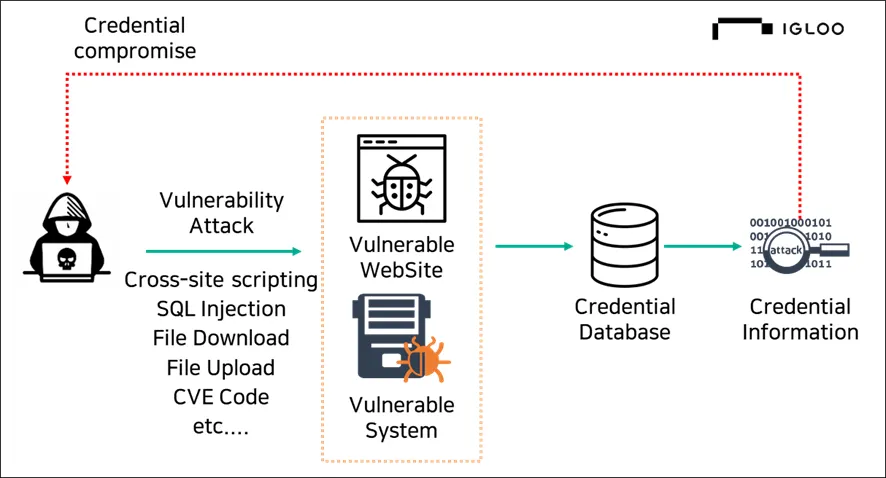 시스템, 애플리케이션, 및 네트워크의 보안 취약점을 악용한 크리덴셜 탈취는 고도화된 기술과 정교한 전략이 결합한 매우 효과적인 공격 기법으로 평가된다. 이러한 공격은 미패치된 소프트웨어, 잘못된 설정, 알려진 취약점, 또는 제로데이(0-Day) 취약점과 같은 보안상의 허점을 직접적으로 공략하며, 이를 통해 크리덴셜 데이터베이스, 세션 토큰, API 키 등 민감한 인증 정보를 수집한다.