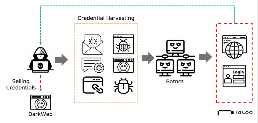 공격자는 먼저 탈취된 크리덴셜을 다크웹에서 구매하거나 유출된 데이터베이스를 통해 확보한다. 확보된 크리덴셜은 크리덴셜 스터핑(Credential Stuffing) 도구를 사용해 다수의 플랫폼에서 자동화된 방식으로 입력되며, 이를 통해 인증 시도가 이루어진다. 성공적으로 시스템에 접근한 경우, 공격자는 민감한 데이터를 수집하거나 권한 상승을 시도하며, 추가적인 네트워크 침투를 이어간다.