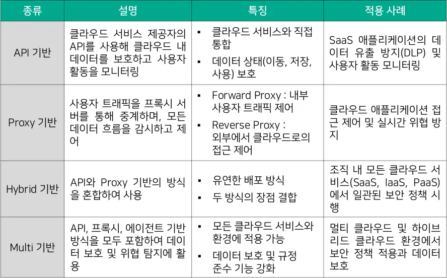 CASB는 클라우드 보안을 강화하기 위해 다양한 방식으로 배포되며, 이를 기반으로 [대응기술 표 3-3] 와 같이 여러 가지 유형으로 분류될 수 있다.