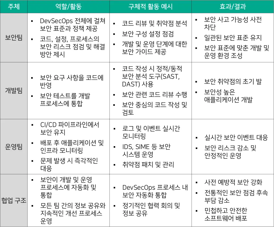[대응기술 표 3-1] DevSecOps 환경에서의 각 팀별 역할 예시