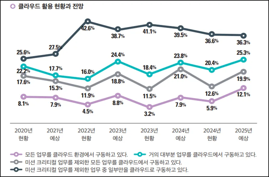 [대응기술 그림 3-1] 클라우드 활용 현황과 전망 (출처 : 2024 국내 클라우드 컴퓨팅 및 AI현황과 전망, IDG Korea)