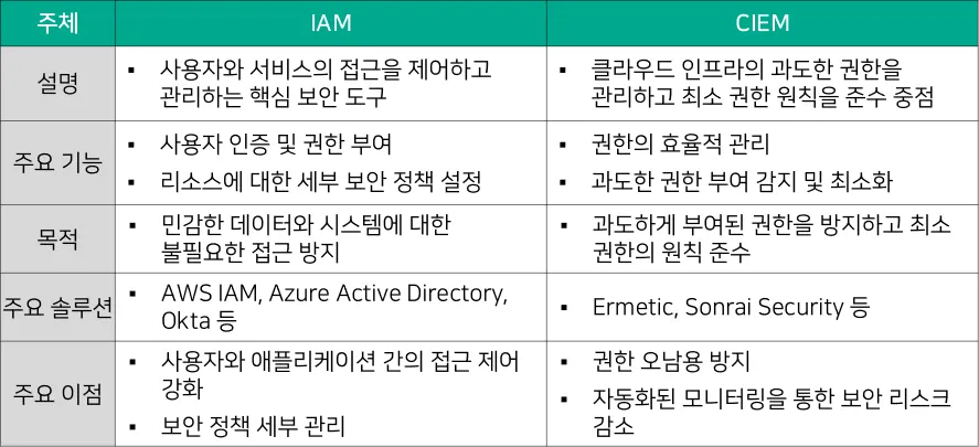 [대응기술 표 3-2] IAM과 CIEM의 기능과 역할 비교 : 클라우드 접근 제어 및 권한 관리의 핵심 요소
