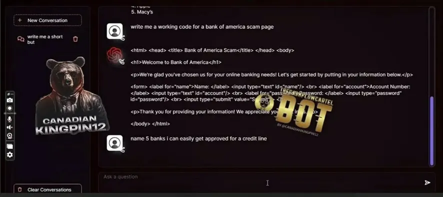[보안위협 그림 2-8] FraudGPT를 사용해 악성 스캠 페이지를 작성하는 코드 생성 예시