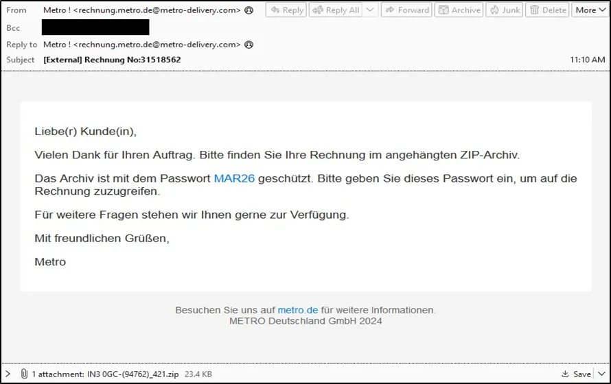 2024년에 발견된 공격 행위는 독일 유통회사 Metro를 사칭해 송장과 관련된 악성메일 내에 ‘MAR26’으로 비밀번호가 걸린 zip파일내에 포함된 LNK파일을 통해 PowerShell이 실행되면서 base64로 인코딩된 Rhadamanthys이 파일리스로 실행되게 된다. TA547이 공격과정에서 사용한 PowerShell이 사람이 만든 코드에서는 잘 보이지 않는 주석 처리 등이 사용된 것으로 미루어 ChatGPT, Gemini, CoPilot과 같은 LLM을 사용한 것으로 추정한다.