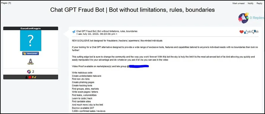 [보안위협 그림 2-7] 언더그라운드 포럼에 공개된 FraudGPT홍보 게시글