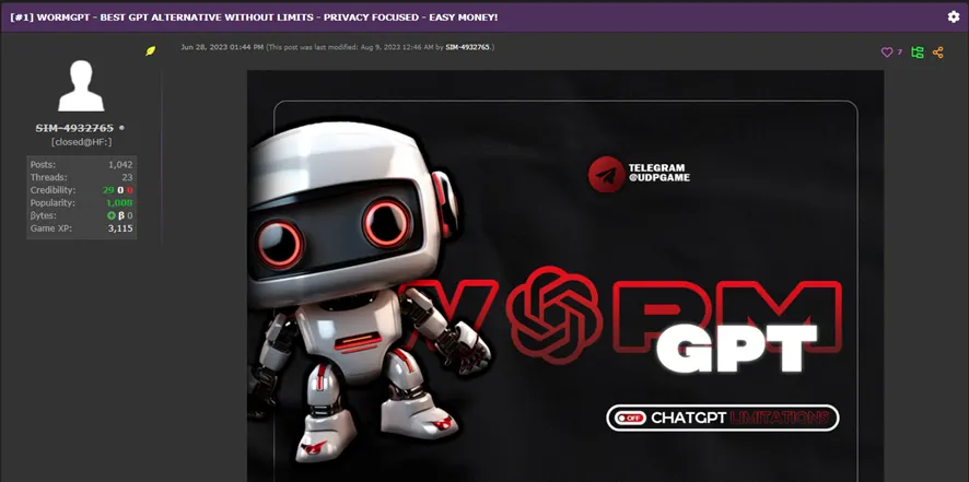 [보안위협 그림 2-5] 언더그라운드 포럼에 공개된 WormGPT 홍보 게시글