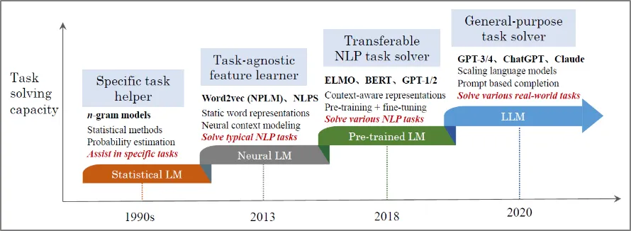 인공지능에서 말하는 LLM은 인간의 언어를 이해하는 데 초점을 맞춰 컴퓨터가 자연어를 이해하고 분석하는 NLP의 일부 기술이다. ‘A Survey of Large Language Models’에 따르면 [보안위협 그림 2-2]와 같이 LLM으로 발전되기 이전에는 n-gram 언어 모델 기반의 통계적 모델인 SLM(Statistical LM)에서 시작되었다.
