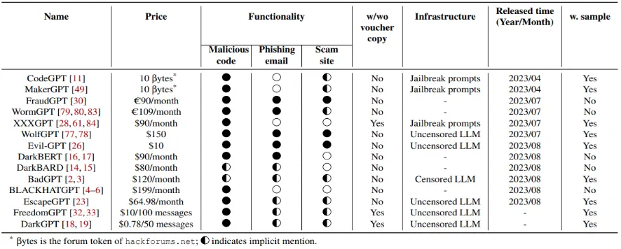 2022년부터 2023년까지 1년간 MGM Grand Market, Hack Forums, XSS.is, BreachForums, BlackHatWorld 등 언더그라운드 마켓 플레이스 9곳의 정보를 토대로 악성 LLM 서비스를 분석한 ‘Malla: Demystifying Real-world Large Language Model Integrated Malicious Services’에 따르면 악성코드 생성(Malicious code generation), 피싱메일 작성(Phishing email writing), 사기 사이트(Scam site)를 생성하기 위해 14개의 악성 LLM 서비스가 존재하는 것으로 나타났다.