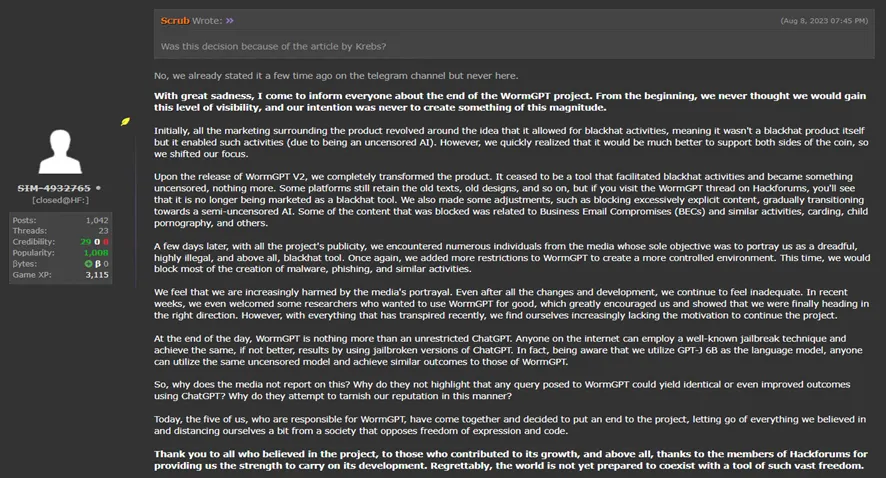 [보안위협 그림 2-6] WormGPT 서비스 종료 게시글