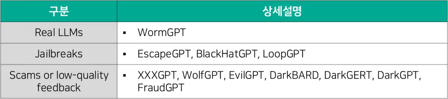 [보안위협 표 2-1] 악성 LLM 서비스 유형